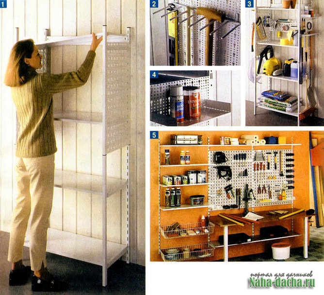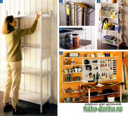 Номера фото с описанием.1-4. С недавних пор в продаже появились сборные стеллажи, состоящие из несущих стоек, полок и боковых стенок из перфорированного металлического листа.