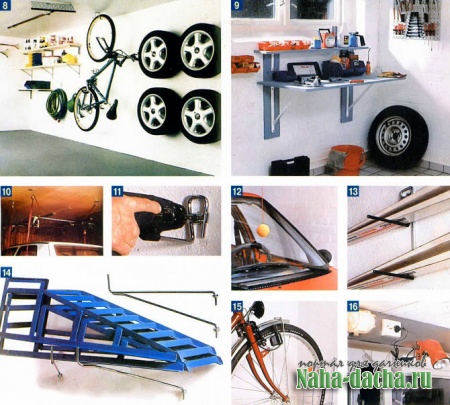 В гаражах, кроме автомобиля, запчастей и принадлежностей к нему, обычно хранят велосипеды, газонокосилки, садовый инвентарь и многое другое. И всё это зачастую не только затрудняет работу в гараже, но и не позволяет даже удобно поставить автомашину. Тем не менее, воспользовавшись специальными кронштейнами, монтируемыми на стенах и потолке, можно упорядочить хранение в гараже многих полезных предметов. Например, перед воротами найдётся место для велосипеда, садовых инструментов или небольшого откидного верстака.