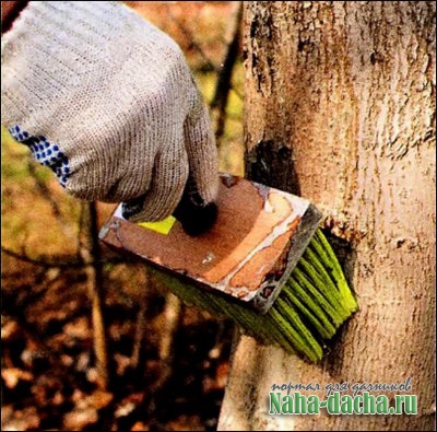 Стволы деревьев необходимо белить в конце лета - начале осени. Подобная мера убережет деревья от зимних солнечных ожогов.