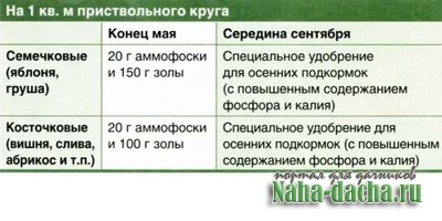 Корневая система взрослых растений прекращает активно распространяться вширь, и подкормки им нужны реіулярно. Их лучше проводить по бороздам глубиной 15-20 см, которые выкапывают по кругу на расстоянии 1,5-2 м от ствола для сильнорослых деревьев и 1 м для слаборослых. Удобрение, растворенное или взмученное в воде, разливают по бороздам и засыпают землей. Можно заменить борозду лунками глубиной 20 см (8-12 на одно растение), их делают на гаком же расстоянии и дозу удобрений равномерно распределяют по лункам.