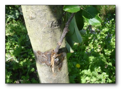 Часто бывает, что кора на яблоне совсем отслаивается и погибает. Причин здесь много - всё те же морозобоины и солнечные ожоги, антракноз и чёрный рак, короеды и грызуны и так далее. Повреждённую кору надо снять, а рану обработать. А если кору штамба слишком сильно обглодали зайцы или повредил короед, то это уже более серьёзная рана, особенно если она кольцевая, так как при этом прекращается снабжение корней яблони продуктами фотосинтеза, и они гибнут от голода. Единственный способ спасти такую яблоню - это сделать прививку «мостиком», то есть черенки яблони привить ниже места повреждения и их же привить выше повреждения, предварительно обработав эти места. До прививки повреждённый штамб надо обвязать плёнкой. Число «мостиков» зависит от размера повреждённого участка коры и возраста дерева, но их должно быть не менее двух даже на штамбе молодого дерева. Часто ниже места повреждения на штамбе имеются побеги. Их тоже можно использовать в качестве «мостика».