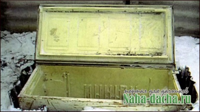 Зимой в сильные морозы каждый день набивал в ямку 20 см снега и заливал водой. За ночь этот слой крепко замерзал. Утром - снова 20 см снега и заливка водой. Этот процесс намораживания льда я прекратил только тогда, когда до поверхности ямки оставалось расстояние, равное величине отрезанного болгаркой холодильника. В намороженную ямку крышкой вверх уложил холодильник.