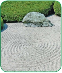 Вода обязательно присуствует в японском саду. Но она не всегда настоящая. Часто ее заменяет засыпанная песком или мелким галечником площадка с вычерченными волнистыми линиями. Рисунок наносится деревянной доской с широкими зубьями и очень похож на подернутую рябью водную поверхность. Такой прием ландшафтной архитектуры называют сухим ландшафтом.