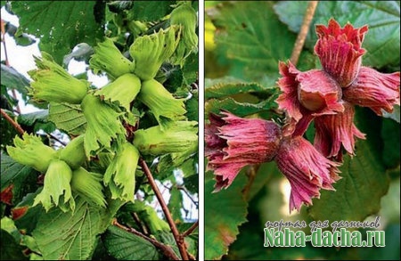 На что же обратить внимание при выборе сорта? Начнем с того, что культивируют в основном два вида этого растения — лещину обыкновенную (Corylus avellana) с круглыми орехами и короткими открытыми плодовыми обертками-шапочками и лещину крупную, или ломбардский орех (Corylus maxima), с цилиндрическими плодами с длинными, сомкнутыми па концах обертками. Именно «головастенькие» плоды последней называют фундуком. Единственное «но» «ломбардца» — орешки приходится вручную высвобождать из оберток. Также популярностью у садоводов пользуются урожайные межвидовые гибриды лещины, например ‘Nottinghams Fruchtbare’.