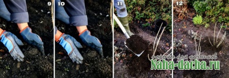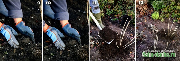 8 Затем укоротите все ветви на треть их длины. 9 Сформируйте вокруг растения земляной бортик, чтобы вода при поливе оставалась в прикорневой зоне. 10 Хорошо полейте новичка. 11+12 Замульчируйте почву вокруг куста просеянной садовой землей или зрелым компостом. Летом под смородиной можно дополнительно насыпать слой мульчи из измельченной коры или травы.