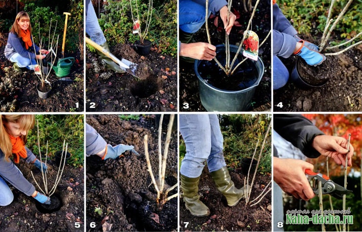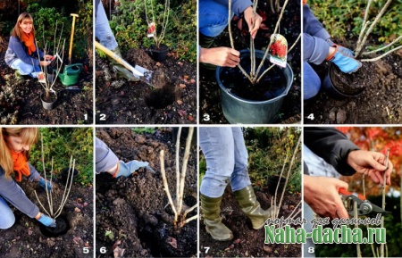 3 Контейнер со смородиной погрузите в емкость с водой и подождите, пока не перестанут всплывать пузырьки. 4 Выньте растение из горшка и 5 поставьте в посадочную яму. 6 Выкопанной землей заполните пустоты между земляным комом растения и стенками посадочной ямы. 7 Почву после посадки слегка притопчите.
