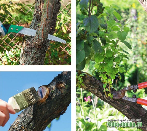 Обрезка больной ветвиЧасто после завязывания плодов отдельные ветви начинают засыхать. Как правило, это связано с грибными заболеваниями в период цветения. При поражении одной из скелетных ветвей, чтобы грибок не распространился на здоровые части дерева, ее необходимо удалить. Если нет возможности сохранить какую-либо часть пораженной ветви, ее выпиливают «на кольцо». Пораженные морозом ветви срезают до здоровой ткани.