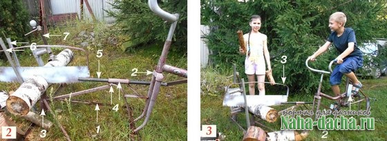 «Велосипед» при работе должен находиться в устойчивом положении, для этого основание задней опоры изготовил из фланца (фото 1 п. 1) от вентиляционной трубы большого диаметра. К нему при помощи электросварки приварил два металлических уголка 50x50 мм длиной 50 см вертикально вверх (2). На эти уголки через резьбовую ось (3) закрепил заднюю вилку велосипедной рамы.