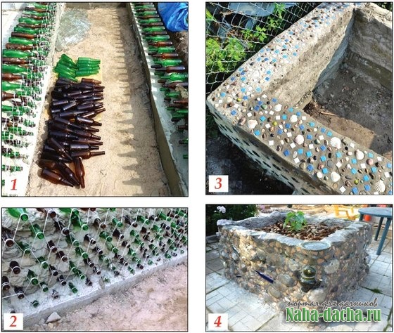 3. После застывания начала класть стены. Тару укладывала донышком наружу, соединяя между собой раствором (фото 1). Горлышки бутылок связала веревкой для жесткости (фото 2). Стены клумбы с внутренней стороны замазала раствором, замуровав все горлышки так, чтобы в них не попадала земля. С внешней стороны оставила донышки, а через пару часов мокрой ветошью разгладила раствор, очистив стекло.