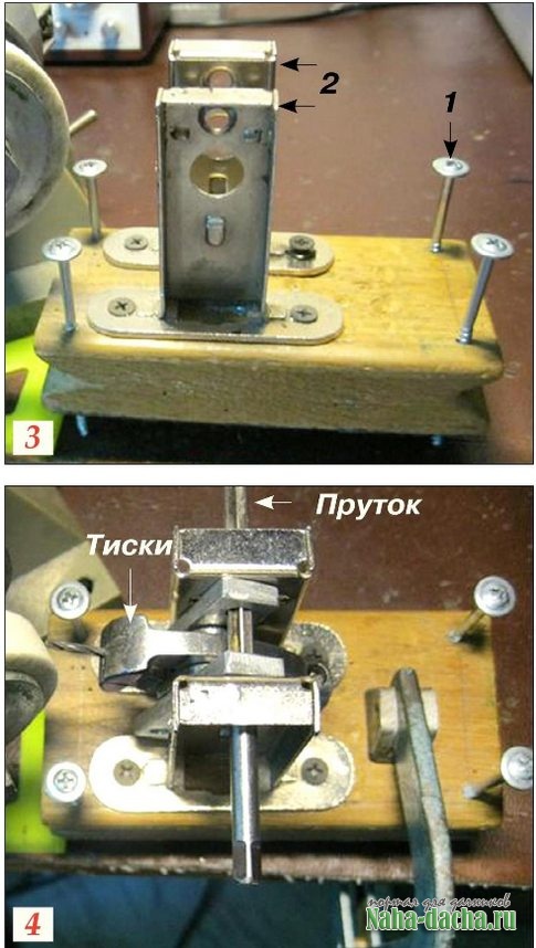 По углам подставки из доски сечением 10x2,5 см длиной 20 см просверлил четыре отверстия под опорные ножки-шурупы для регулировки высоты (фото Зп. 1) На основание вертикально установил корпуса двух врезных дверных защелок без внутренностей (2) так, чтобы между ними свободно поместились переделанные тиски. Зафиксировал их между защелками при помощи съемного квадратного прутка сечением 8x8 мм (фото 4), протянув его через отверстия в пластинах.