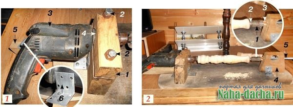Для изготовления фигурных подставок, ножек для табурета и балясин смастерил сборно-разборный токарный станок по дереву из дрели.