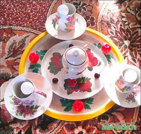■ В кладовой нашел большой металлический поднос, который очистил от ржавчины, загрунтовал и покрыл белой спрей-краской. В центр приклеил вырезанный из мешковины круг подходящего диаметра, немного придал ему белизны той же краской, дал высохнуть и при помощи трафарета акриловой краской нанес узор в виде цветов и листочков. Все покрыл бесцветным лаком в один слой.