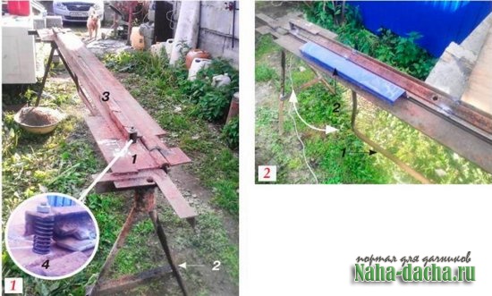 В качестве основы использовал фрагмент рамы от гаражных ворот (фото 1 п. 1), состоящий из двух частей длиной 2,5 м, оставшийся после ремонта гаража. К одной из половин фрагмента снизу приварил ножки (2), сваренные из кусков трубы d 30 мм и уголка 50x50 мм (длину выбирал под свой рост). Затем из уголка сечением 50x30x4 мм, для усиления приварив к нему полосу сечением 40x4 мм, изготовил прижимную планку (3) Закрепил ее на верхней плоскости основания при помощи болтов и гаек М12. Между деталями поместил клапанные пружины (4) от автомобиля «УАЗ» (можно взять любые другие подходящие по размеру).