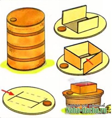 • Крышка для мангала. Второе дно от бочки приспособил для мангальной крышки (см. рис.). Для этого сделал Н-об-разный разрез в крышке, отогнул края вертикально и обогнул их листом жести вокруг, чтобы получилась «коробка».