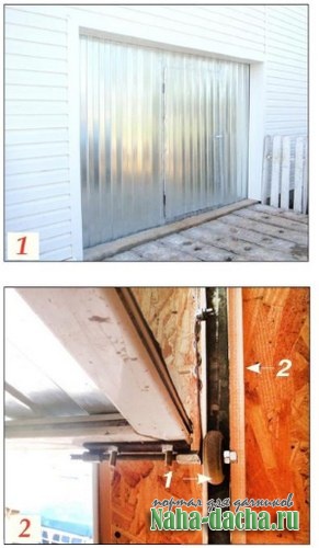 Для облегчения подъема конструкции и удержания ее в поднятом состоянии использовал противовес — кусок рельсы (фото 4, п. 1). К осям роликов (фото 2 п. 1), закрепленных внизу створки ворот, прикрепил металлические тросики.