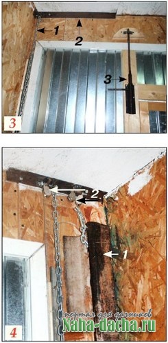 Створку ворот подвесил на цепях (фото 3 п. 1), закрепленных на металлических уголках (2). Последние зафиксировал в верхних углах гаража к передней стене. Место крепления цепей выбрал такое, чтобы верхняя часть створки под собственным весом сама прижималась к проему, а нижний край входил в углубление в полу, что не дает створке сдвинуться.