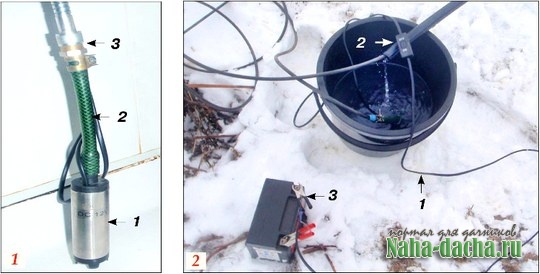 В магазине автозапчастей купил насос (фото 1 п. 1) напряжением 12 В для перекачки дизельного топлива. Зафиксировал на его выходном патрубке кусок шланга (2) подходящего внутреннего диаметра, на самом шланге закрепил переходник (3) — штуцер с резьбой 1/2. К штуцеру прикрутил шланг от душа с разбрызгивателем. К насосу уже был подсоединен провод (фото 2 п. 1), на котором есть выключатель (2) и два зажима (3) для подключения его к аккумулятору. Достаточно поместить насос в емкость с водой (ведро, фляга и т. п.), а зажимы подключить к автомобильному аккумулятору, который питает насос, чтобы подавать воду по шлангу к лейке.