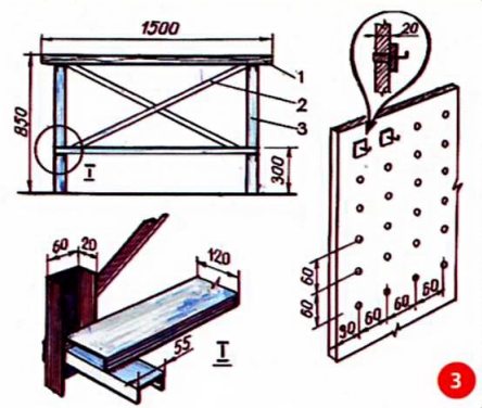 Стремясь правильно разместить оборудование, в самой освещенной зоне установил верстак для столярных работ, использовал для этого столешницу от старого стола, а сверху обил ее листом жести. Из реек сечением 50x50 мм собрал стеллажи, в которых будет храниться инструмент, мелкие заготовки и детали (рис. 2, 3). На крышке рабочего стола верстака установил тиски, а для удобства во время работы подогнал высоту верстака по своему росту. Получилось компактно, в помещении осталось достаточно свободного пространства, и я обеспечил удобный подход к рабочему месту.