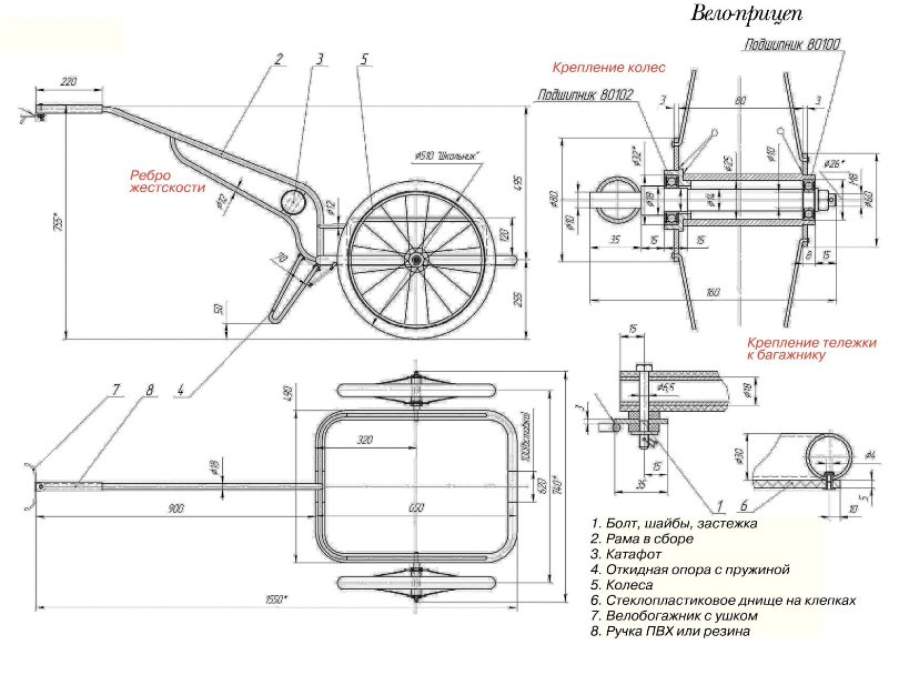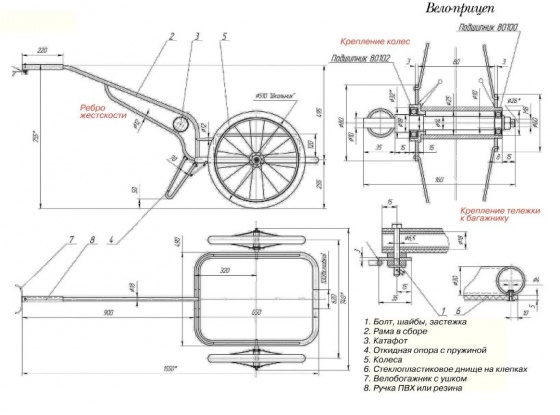 К велосипеду прицеп креплю болтом М8 с гайкой, дополнительно подложив две резиновые шайбы (они смягчаютудары), а контрольная булавка не позволяет потерять тележку в дороге (рис. 2).