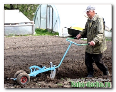 Из металлической трубы d 20 мм изготовил Т-образную ручку подходящей длины и в ее хвостовике (нижняя часть) также просверлил отверстие для шплинта. Для транспортировки лебедки завожу штыри тележки в направляющие, при помощи ручки опрокидываю конструкцию на себя и без особых усилий перевожу ее по участку.