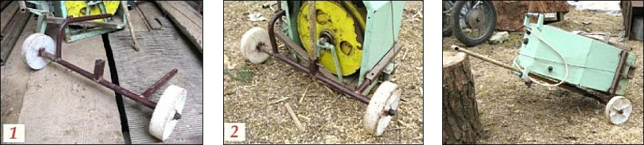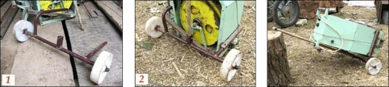 Из металлической трубы d 20 мм смастерил ось на длину основания лебедки с припуском 15 см на каждую сторону. На ее концах закрепил колеса от штатного плуга (фото 1)