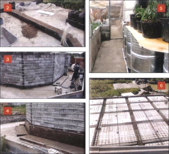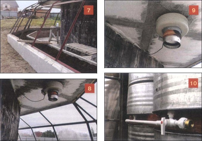 Г рядка в теплице построена из цементно-песчаных блоков и монолитного бетона. Крыша - монолитная, кессонного типа, в такой крыше нагрузку несут ребра из бетона. Для формирования ребер в крыше использовал пенопласт (фото 6). С юга от жаркого солнца и перегрева теплицу защищает 1,5-метровый выпуск крыши.