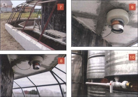 Для увеличения теплоемкости в теплице было установлено десять 200-литровых бочек, для залива и слива воды соединенных полипропиленовой трубой диаметром 20 мм (фото 10). Для полива эта вода не используется - для этого забираем воду из пруда. По расчетам выходило, что общая оценка теплоемкости теплицы - около 10-12 кВтч/град.