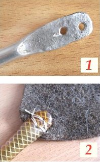 Из старого валенка (можно из войлочной стельки) вырезал боек-лопасть размером 100х 150 мм. Для ручки использовал алюминиевый пруток d 15 мм длиной 350 мм. Расплющил один его конец и просверлил в нем два отверстия d 2,5 мм (фото 1); снял в отверстиях фаски и зачистил заусенцы. На алюминиевую заготовку надел отрезок ПВХ трубы подходящего диаметра и длины, предварительно надрезав один ее конец в месте крепления к бойку.