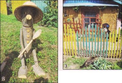 Мы с мужем, например, из поленьев, сучьев и других деревяшек смастерили для сада целую коллекцию фигурок по мотивам народных преданий и мультфильмов (фото 1). Среди забавных обитателей есть Л есовичок-боровичок, крокодил Гена, Лиса-невеста, Заяц с Козликом и даже Бабушка-байкерша. Но мне больше всех нравится Повар, который в зависимости от наряда может быть то военным, то деревенским (фото 2). О том, что в нашем доме живут жизнерадостные люди с фантазией, прохожие могут догадаться, даже не заходя за калитку. Для этого достаточно взглянуть на его фасад (фото 3). Мне кажется, что даже в ненастье и холод такие яркие летние краски способны согревать сердца и вызывать улыбки.