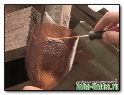 Крылья вырезала из 5-литровых бутылок, хвост — из металлической сетки в форме треугольника (крепила его вершиной к туловищу, чтобы основание хвоста упиралось в землю). Зафиксировала эти детали на канистре саморезами.