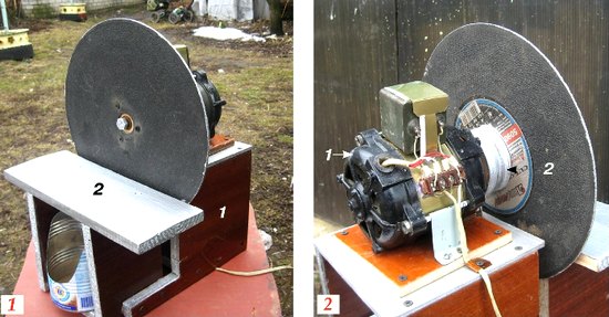 2. На вал двигателя напрессовал деревянный переходник (2) d 80 мм для крепления абразивного круга(использовал стандартный круг от болгарки) и закрепил его болтом. Диск к переходнику прикрутил саморезами.