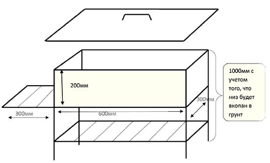Из листового металла толщиной 3 мм вырезал болгаркой нужное количество деталей необходимых размеров (см. чертеж.) Сварил из них прямоугольный короб. На две длинные боковины наварил по одному отрезку уголка 40x40x4, чтобы стенки не деформировались от высокой температуры. Из того же уголка нарезал ножки нужной длины (см. рис.) и приварил их к коробу. Примерно посередине соединил ножки перекладинами — они дополнительно выполняют функцию полки. К одной из коротких боковых сторон приварил полочку в виде рамы из уголка с вваренными внутри прутками. Дополнительно для мангала изготовил крышку из листа металла толщиной 3 мм.