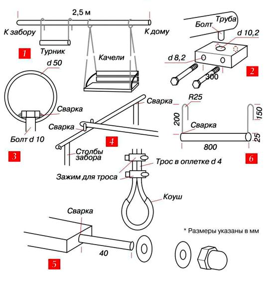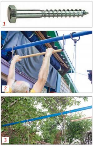 Владимир Крепский из Могилева небольшое пространство между стеной своего дома и забором использовал очень практично: для качелей и турника,которые легко можно снять или передвинуть. Нарисовал эскиз всей конструкции (см. схему 1). Сначала изготовил опоры для горизонтальной трубы. К деревянной стене дома прикрепил болтами по дереву (фото 1) кусок металлической трубы квадратного сечения, предварительно просверлив в ней по одному отверстию вверху и внизу, и по два отверстия напротив друг друга на передних и задних сторонах (схема 2).