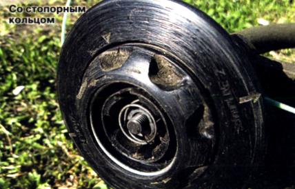 Для удерживания родного пыльника в шпульке потребовалось зажать ее в патроне токарного станка и резцом проточить канавку под стопорное кольцо глубиной 1 мм и шириной 2 мм. Само стопорное кольцо я загнул на обрезке водопроводной трубы из велосипедной спицы и откусил лишнее по месту. После несложных ремонтных работ установил головку на бензокосу, надел пыльник, заправил леску и вышел в сад на испытания. Все работает! Как следует! Нажал на обновленный выступ - леска удлинилась. После покоса пыльник остался на месте. Шлицевые поверхности не забились травой и землей.