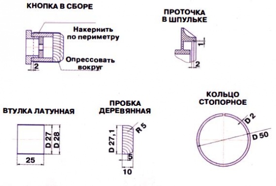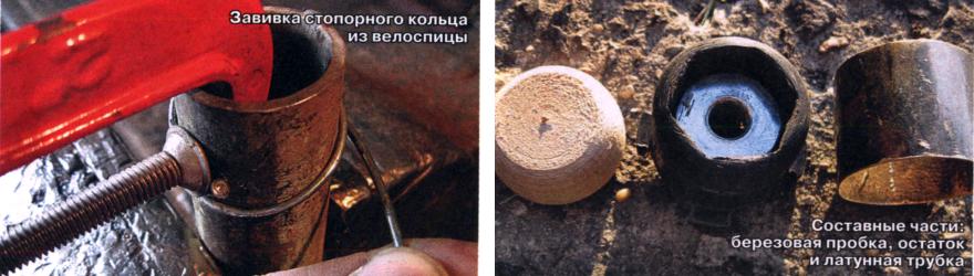 От старого духового инструмента отрезал кусочек латунной трубки длиной 25 мм с внутренним диаметром 27 мм. При помощи наждака и напильника зачистил торцы. Затем легкими ударами молотка напрессовал трубку на пластмассовый корпус втулки нажимного механизма. Из березовой палки выстрогал пробку длиной 10 мм с наружным диаметром 27 мм и тоже запрессовал ее в латунную трубку сверху, до упора во втулку.