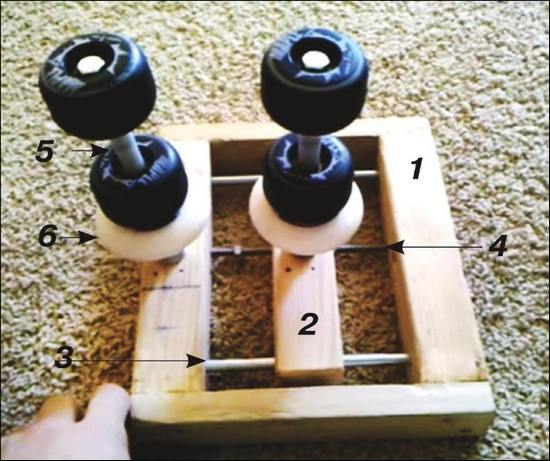 Выбрав оптимальное расстояние между осями с роликами (зависит от размеров руки), зажимаю подвижную планку гайками и, вставив руку между роликов, массирую ее, передвигая аппарат. Для удобства в дальнейшем каждую роликовую ось дополнил пластиковым ограничителем (6).