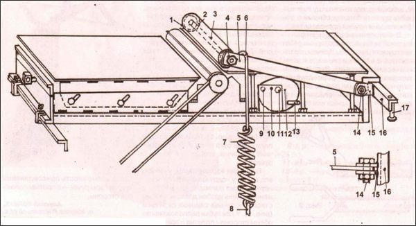 1 — прижимной вал (труба d 60-80 мм), 2 — подшипник (2 шт.), 3 — ось с резьбой на конце, 4 — гайка, 5—пластина 450x50x12 мм, 6 — тяга, 7 — пружина, 8 — крепление пружины, 9 — ось эллипса, 10 — пластина (2 шт.), 11 — стопор, 12 — эллипс, 13 — рукоятка, 14—болт-ось М14, 15 — проушина (2 шт.), 16 — уголок, 17 — болт крепления