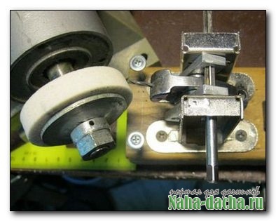 Для мелких деталей (шкантов и чопиков) изготовил приспособление из плашко-держателя (фото 1) К одной его ручке под прямым углом приварил отрезок уголка 40x40 длиной 200 см. В последнем в одной полке просверлил несколько отверстий d 5 мм. Стойку закрепляю на верстаке саморезами (через отверстия), в плашкодержателе фиксирую инструмент для нарезания резьбы (плашку) нужного диаметра. В патроне шуруповерта зажимаю одним концом деревянную рейку, второй ее край вставляю в плашку (фото 2). Включаю инструмент и начинаю перемещать его вперед-назад вместе с деревяшкой в держателе (фотоЗ). В результате получается заготовка ровной цилиндрической формы. После разрезаю ее на крепежные детали нужной длины.