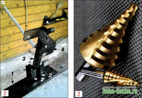 Важно! Крепежные отверстия в скобе должны строго совпадать с отверстиями на инструменте, это обеспечит надежность и жесткость крепления. Их лучше сверлить ступенчатым сверлом (фото 2).