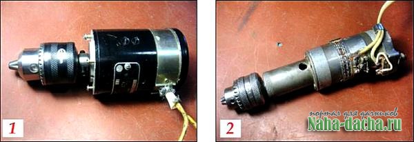 ■ На осях каждого мотора заменил подшипники, чтобы избавиться от люфта, и зафиксировал на них патроны. К одному двигателю (фото 1) подсоединил провода с вилкой для подключения к сети напрямую, а к контактам второго механизма (фото 2) припаял провода с тумблером.