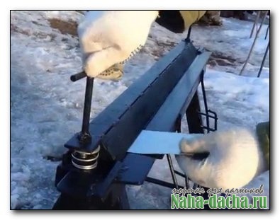■ Лист оцинкованного металла толщиной 1 мм размером 70x50 см загнул с одной короткой стороны под углом примерно 30 град, (чтобы удобно было толкать лопату за ручку) на ширину 15 см. На получившемся Г-образном основании по краям перпендикулярно загибу закрепил саморезами две боковины из доски сечением 15x2 см.