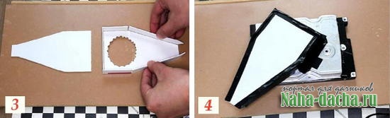 Из плотного картона изготовил воздуховод (размеры и форма произвольны) (фото 3) и термопистолетом приклеил его к верхней части крышки (фото 4). Для надежности соединения стык закрыл изолентой.