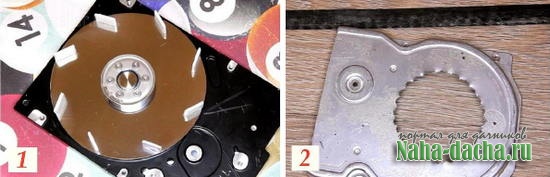 Открутил крышку прибора и убрал лишние детали, оставив только привод с диском. К последнему прикрепил суперклеем пластмассовые лопасти (фото 1). я В крышке пилкой по металлу вырезал отверстие для выхода воздуха (фото 2)
