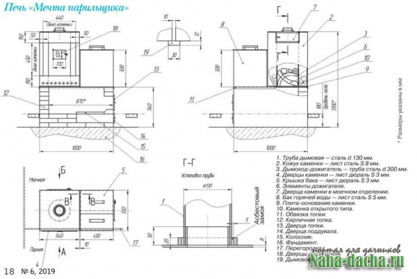 Печь для дачной баньки■ Учитывая размеры старой печи и помещения, подготовил чертеж новой конструкции (см. рис.). Частично разобрал старую печь, оставив лишь топку с трубой-дожигателем. Трещины на кладке замазал глиной.