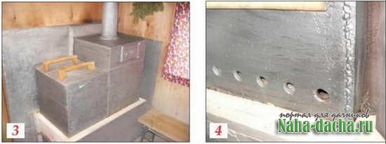 ■ Для лучшей подачи тепла в парную под дверцами каменки просверлил девять отверстий d 20 мм (фото 4) Корпус каменки и бак покрасил термостойкой серебрянкой, а печь побелил.