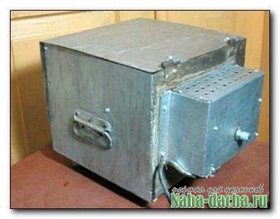 8. Используя дверную петлю и заклепки,закрепил на основании крышку, а чтобы она не открывалась при транспортировке печи, с противоположной стороны прикрутил защелку. Внутрь установил диски-решетки.
