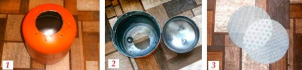 Делаем мини - печь 1. У баллона спилил болгаркой ручки и вырезал вентиль. Так как поддув будет осуществляться вентилятором от блока питания ПК, по его диаметру вырезал в дне необходимое отверстие (фото 1).
