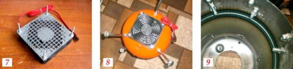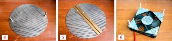 5. Следующая комплектующая печи — поддув. На вентиляторе закрепил прокладки из паронита (фото 6). Из той же листовой пластины (что и для дисков) вырезал прямоугольную защитную накладку, рассверлил в ней отверстия и зафиксировал на вентиляторе (фото 7), к которому предварительно присоединил провод с USB-штекером для подключения к портативному зарядному устройству.