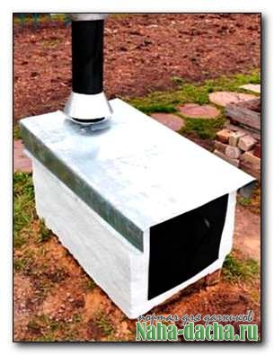В террасе заложил печным кирпичом один из входных проемов — получилась противопожарная стенка. Рядом на полу сложил постамент высотой в три кирпича. На него по уровню установил печь. На крышку — дымовую трубу.