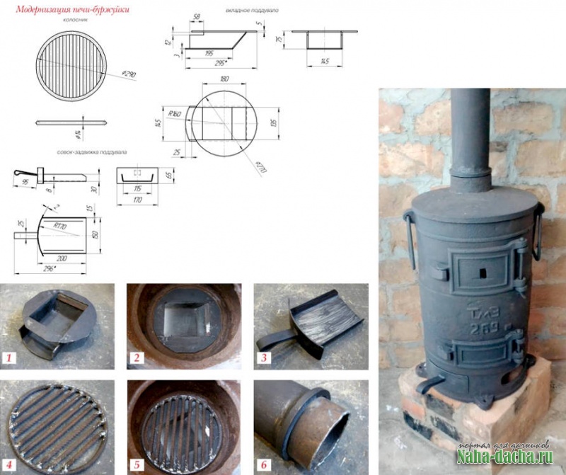 Делаем модернизацию печи-буржуйкиВместо чугунного диска днища по эскизу из листового металла толщиной 5 мм сварил вкладное (съемное) поддувало (фото 1) Вырезал в нем проем под зольник. Установил поддувало в корпус (фото 2), все отлично вложилось в нижний литейный ободок. Небольшие стыковочные зазоры будут пропускать кислород в режиме длительного горения.
